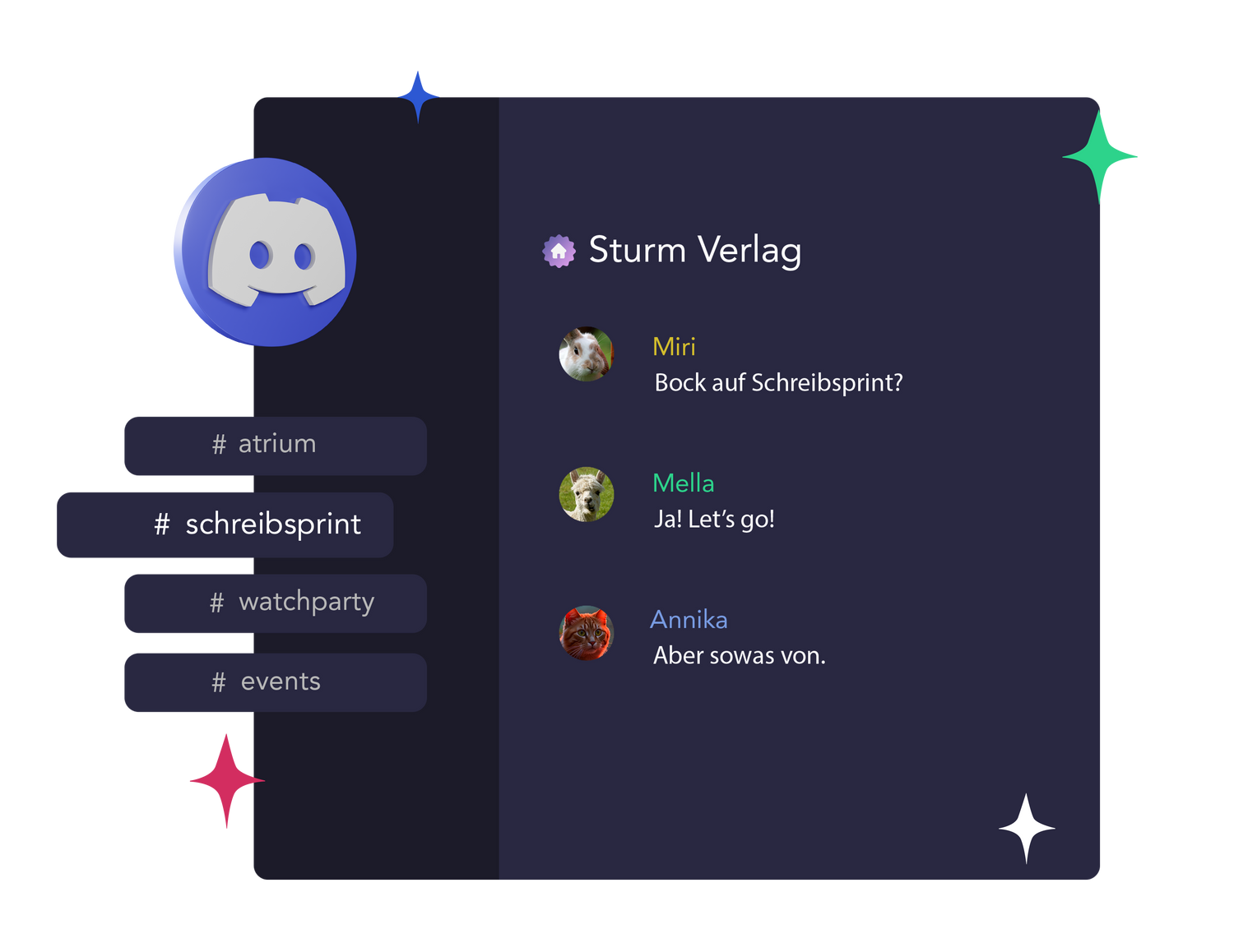 Austausch ist wichtig. Auf unserem Community-Discord gibt es regelmäßige Schreibsprints, Workshops, Coworking-Abende und ganz viel Quatsch.